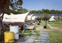The campsite includes tents, string lights, barbecue equipment, and a plethora of activities such as…
