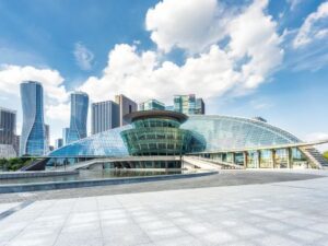 The Hangzhou Grand Theatre is located by the Qiantang River. The building was designed by Mr. Carlos Ott, a famous
