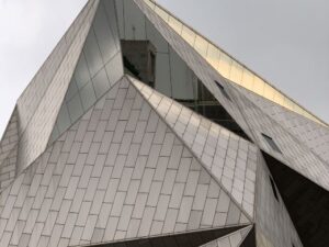 The Normal University Art Museum is an irregular building constructed from triangular pure titanium plates, creating a striking visual contrast