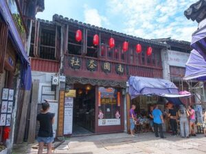 The teahouse is entirely of traditional brick and wood structure. The facade is decorated with wood carvings in Qing Dynasty
