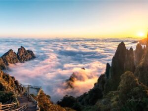 The sea of clouds in Yizhang is famous for its magnificence and unpredictability. The viewing spots include Mangshan Wuzhi Peak,