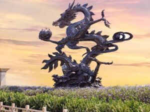 The Dragon Sculpture Square features a large dragon sculpture cast from purple copper, weighing 5000 kilograms, standing atop the mountain