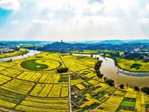Sanyu Rapeseed Flowers is located in Chongqing, where nearly eight thousand acres of rapeseed fields shine under the sun, presenting