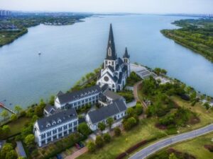 The Catholic Church in the park is close to Yangcheng Lake. The church is a Gothic building with a white