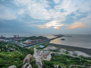 The Donghai Bridge starts from Luchao Port in Pudong New Area (formerly Nanhui District) of Shanghai. It is connected to
